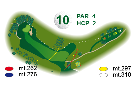 La buca 10 offre un tee shot entusiasmante, che porta a tagliare il dog leg verso destra che caratterizza questa buca. I giocatori più potenti, tagliando il dog leg, avranno un approcio al green decisamente corto; da valutare bene dunque le vostre possibilità, in quanto se rimanete corti si finisce in out. Il green, incassato su una sponda naturale del terreno, è difeso in entrata da un grande e profondo bunker.