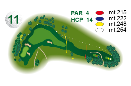 Anche la buca 11 non è molto lunga: è un par 4 facilmente accessibile usando un'attenta strategia ed una precisione nel tiro. L'ideale nel tee shot è volare sopra il bunker posto sulla sinistra del fairway; infatti in questo modo c'è abbastanza spazio per fermare la palla ed avere un comodo approcio al green. Attenzione al fuori limite che accompagna tutta la buca sulla parte destra e al terreno incolto sulla sinistra.