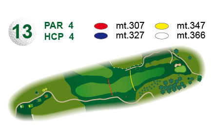 Alla buca 13 abbiamo ancora un tee shot in discesa con la seconda parte della buca in salita caratterizzata da un notevole dislivello. E' un par 4 lungo, con il green nascosto e difeso a sinistra da un profondo bunker. Il green è abbastanza profondo e presenta notevoli ondulazioni. Anche in questa buca la qualità del vostro tee shot sarà importantissima per il vostro proseguo.