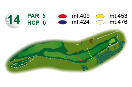La buca 14 è un par 5 lungo e presenta in primo piano un dog leg verso destra che interessa il tee shot, poi un leggero dog leg verso sinistra in salita che porta ad un restringimento del fairway fino al green. La buca è accompagnata su tutto il lato destro dal fuori limite, e nella parte terminale il fairway è inclinato verso l'out. Il green, piuttosto grande, presenta diverse pendenze di non facile lettura.