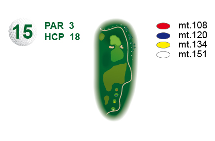 Ultima buca nella parte alta del percorso: un par 3 con partenza sempre dall'alto. Il green è molto generoso ma anche molto ondulato, ed è ben difeso sui lati da due bunkers in entrata. Dietro al green c'è subito l'out con una forte depressione del terreno appena dopo il green; quindi se si va lungh conviene giocare una palla provvisioria.