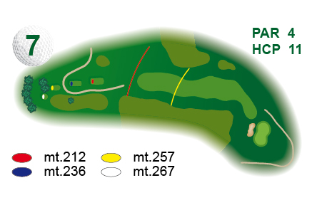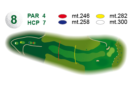Con la buca 7 si esce dal bosco; fare attenzione alle parti incolte con erba molto alta che caratterizza questa parte di percorso fino alla buca 15. La buca, non lunga, è in salita con terreno molto ondulato ed un dog leg a gomito nella parte finale. Il green è difeso da un bunker che entra più o meno in gioco a seconda di dove si è arrivati con il tee shot.